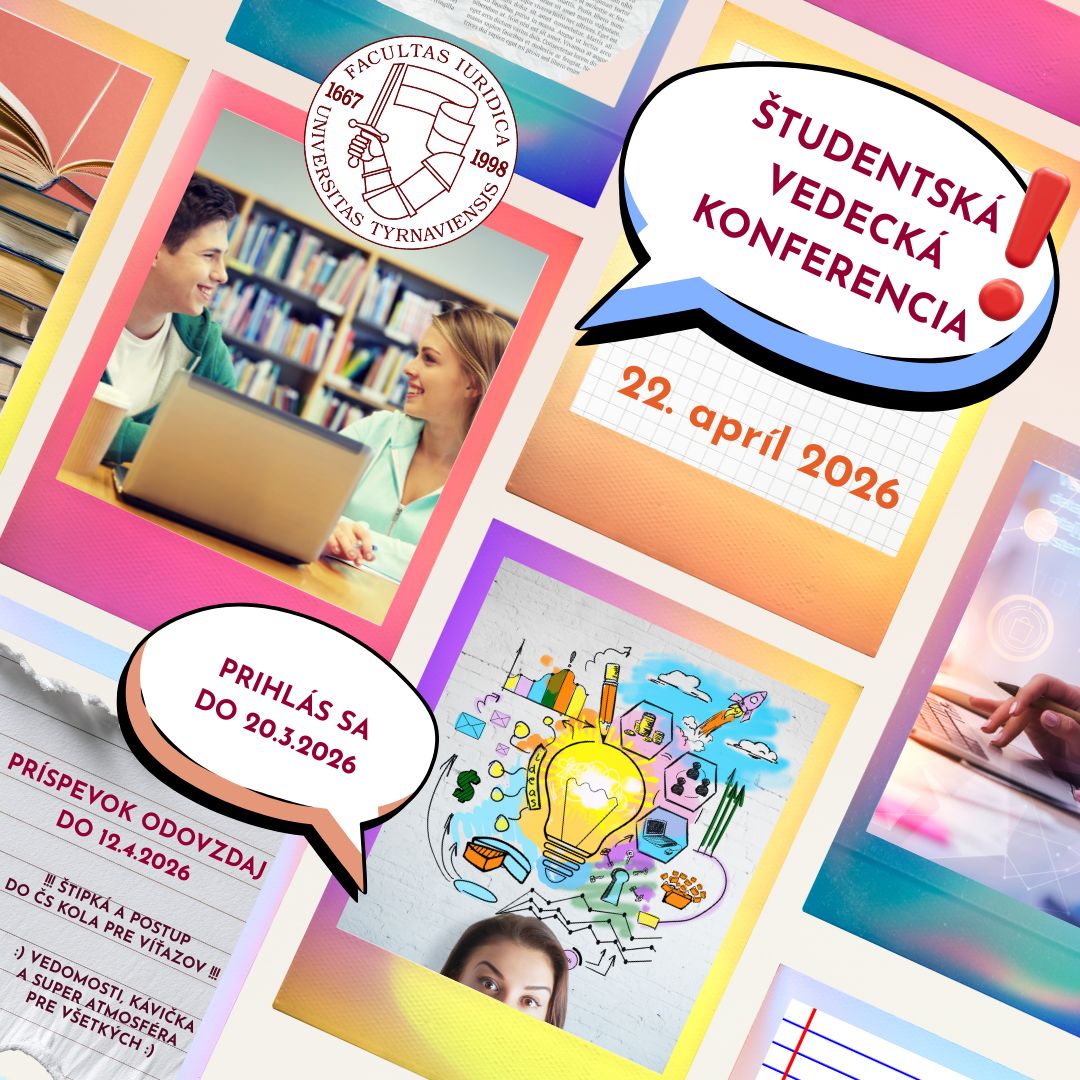 Pracovnou náplňou každého právnika je práca s textom - od hľadania podkladov v odborných prameňoch, cez spracovanie vlastných argumentov, až po prednes. To všetko Vám ponúka zapojenie sa do Vedeckej študentskej konferencie už teraz, počas štúdia. Účasť na konferencii je výbornou prípravou nielen na písanie a obhajobu záverečnej práce, ale aj na právnickú prax. Účasťou na konferencii tak získate nenahraditeľné skúsenosti a publikačný výstup, keďže všetky príspevky odporučené hodnotiacou komisiou a recenzentom budú spracované do zborníka z konferencie (zborníky z minulých rokov: https://publikacie.iuridica.truni.sk/studentska-konferencia/).
