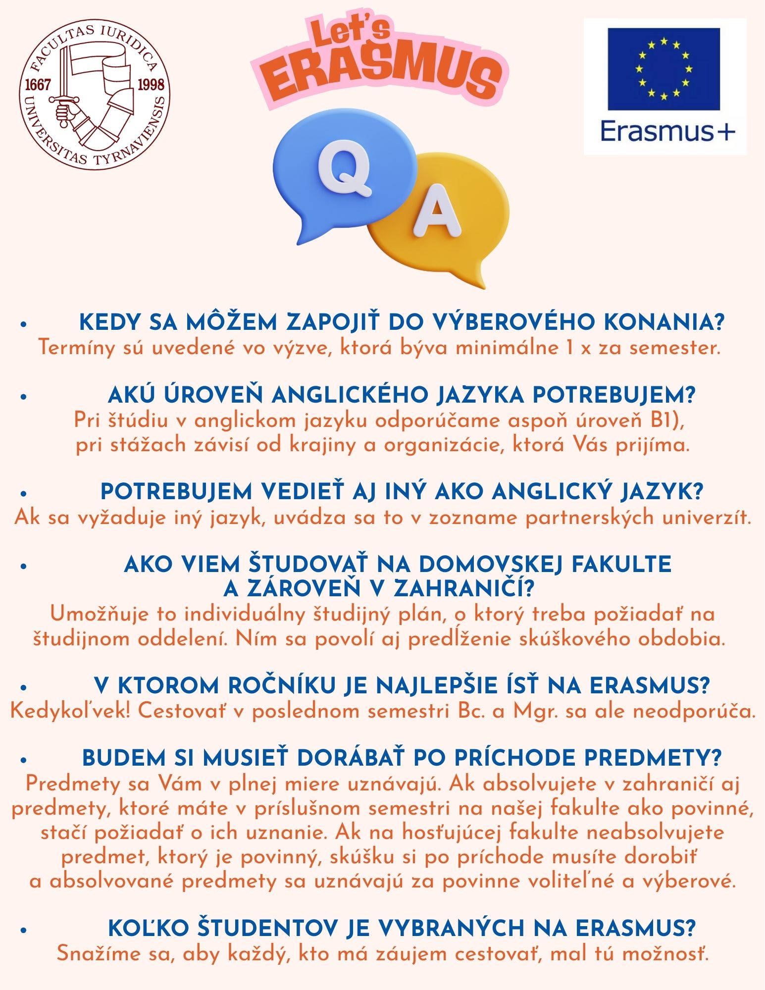 Výber študentov sa na Právnickej fakulte Trnavskej univerzity v Trnave realizuje na základe príslušného usmernenia dekana https://iuridica.truni.sk/sites/default/files/dokumenty/fakulta/.... Študent/ka sa do výberového konania prihlasuje vyplnením prihlášky, ktorú odovzdá spolu so sprievodnou dokumentáciou. Výberové konanie sa uskutočňuje spravidla v akademickom roku predchádzajúcom roku absolvovania zahraničného pobytu.
