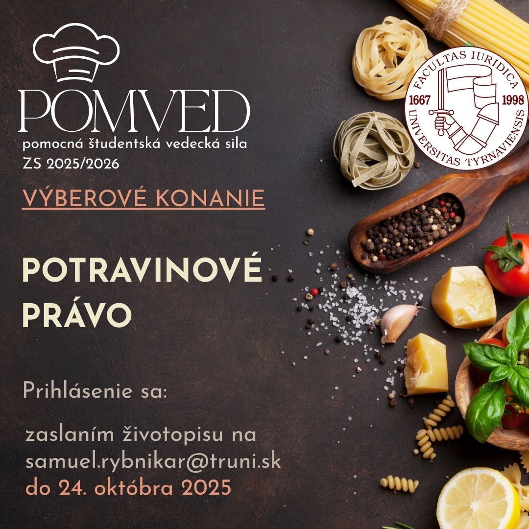 Vážené študentky, vážení študenti, dávame do pozornosti vyhlásené výberové konanie na pomocnú študentskú vedeckú silu. Tútor: dr. Rybnikár. Oblasť zamerania: potravinové právo.
