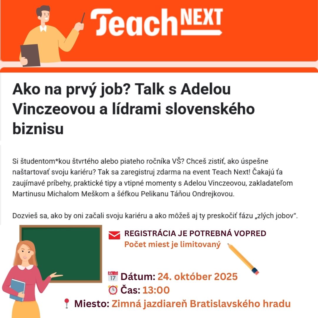 Vážené študentky, vážení študenti, dávame do pozornosti možnosť účasti na podujatí Teach: Ako na prvý job? Talk s Adelou Vinczeovou a lídrami slovenského biznisu. Na podujatie je potrebné sa registrovať: https://docs.google.com/forms/d/e/1FAIpQLScH1A1yjn90MR2i_lgvyuPlSePKITtAfX5ULmoVXM2OrldZ4A/viewform