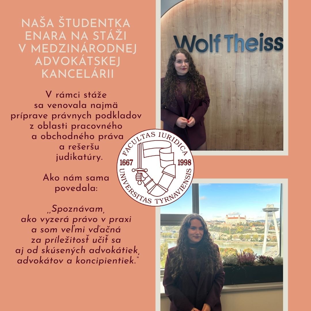 Od zimného semestra ak. roka 2023/2024 prinášame našim študentom novú možnosť stážovania nad rámec klasických stáží, ktoré si naďalej môžu dohodnúť s našimi partnerskými subjektmi či inými subjektmi podľa vlastnej preferencie. Ide o tzv. POMVED-STÁŽE, ktoré už neprebiehajú len na našich katedrách, ale aj mimo fakulty, a to na Najvyššom súde SR, Najvyššom správnom súde SR, Úrade pre verejné obstarávanie a v organizácii Zvierací ombudsman. Za absolvovanie stáže dostanú študenti kredity a za absolvovanie POMVED-STÁŽE dostanú kredity a môže im byť pridelené aj motivačné štipendium. Lebo nám záleží na praktickom vzdelávaní... :)