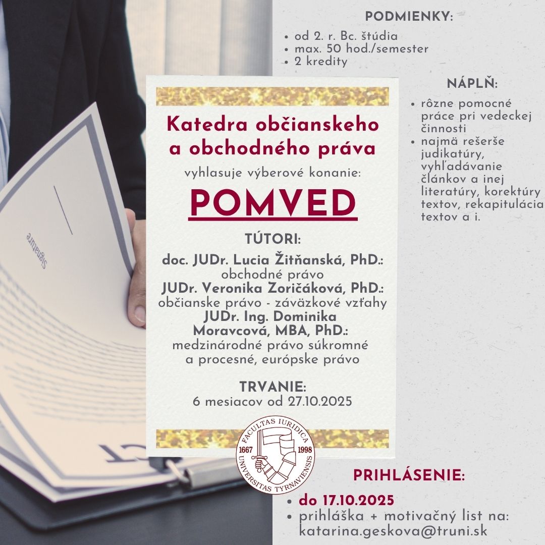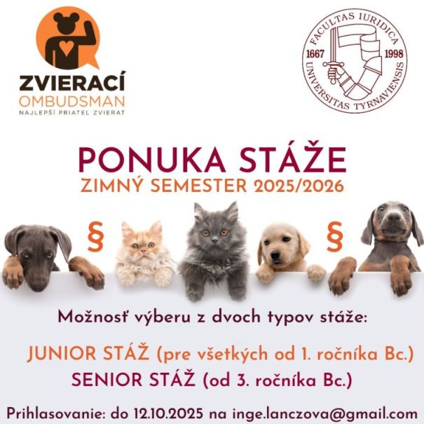 Vážené študentky, vážení študenti, na týchto linkoch nájdete aktuálne ponuky stáží zabezpečovaných fakultou a ohodnotených kreditmi: https://iuridica.truni.sk/oznamy/ponuka-staze-zvieraci-ombudsman http://iuridica.truni.sk/oznamy/vyberove-konanie-na-pomved-zs-2526-katedra-obcianskeho-obchodneho-prava https://iuridica.truni.sk/oznamy/ponuka-staze-na-stalom-zastupeni-slovenskej-republiky-pri-eu-sz-eu-brusel https://iuridica.truni.sk/oznamy/ponuka-staze-na-ministerstve-spravodlivosti-sr https://iuridica.truni.sk/oznamy/ponuka-staze-v-centre-pravnej-pomoci-0 https://iuridica.truni.sk/oznamy/ponuka-staze-na-najvyssom-sude-sr-pre-studentov-2-3-stupna-studia-s-aktivnou-znalostou-2 http://iuridica.truni.sk/oznamy/ponuka-staze-na-nss-sr-0 https://iuridica.truni.sk/oznamy/ponuka-staze-na-katedre-trestneho-prava-kriminologie-pomved Stáže si môžete dohodnúť aj samostatne: http://iuridica.truni.sk/prax-staze V prípade otázok kontaktujte prodekanku pre vzdelávanie.