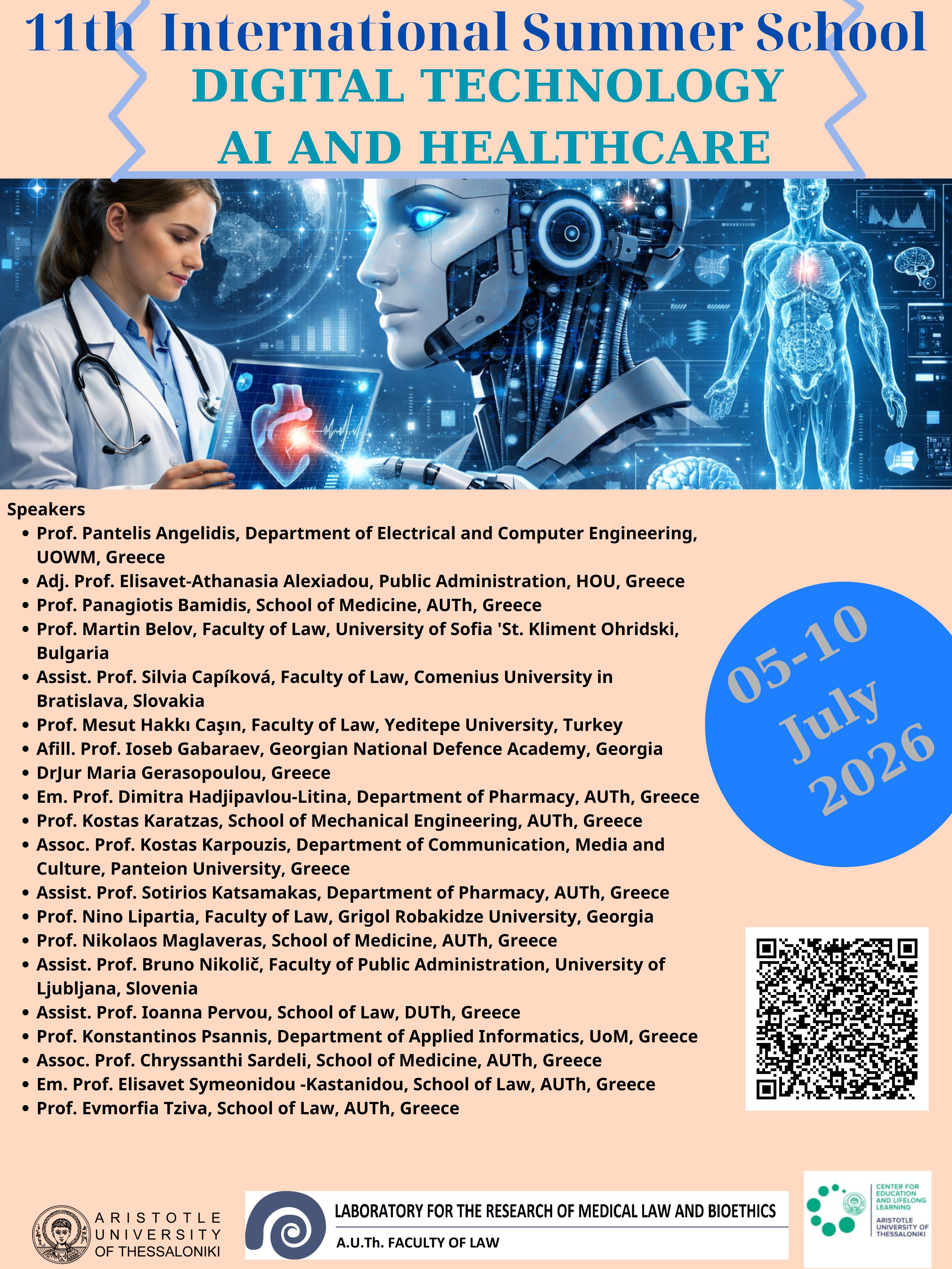 dávame do pozornosti ponuku našej partnerskej univerzity v gréckych Thessalonikách (Aristotle University of Thessaloniki), ktorá usporadúva 11. ročník International Summer School: Medical Law and Bioethics na tému DIGITAL TECHNOLOGY, AI AND HEALTHCARE.