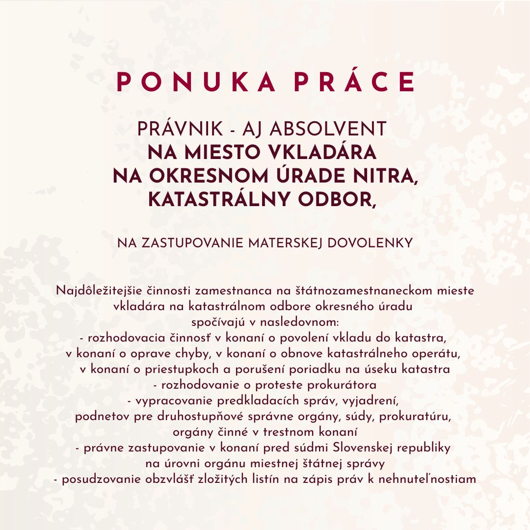 dávame do pozornosti ponuku práce pre právnika - aj absolventa, na miesto vkladára na Okresnom úrade Nitra, katastrálny odbor.