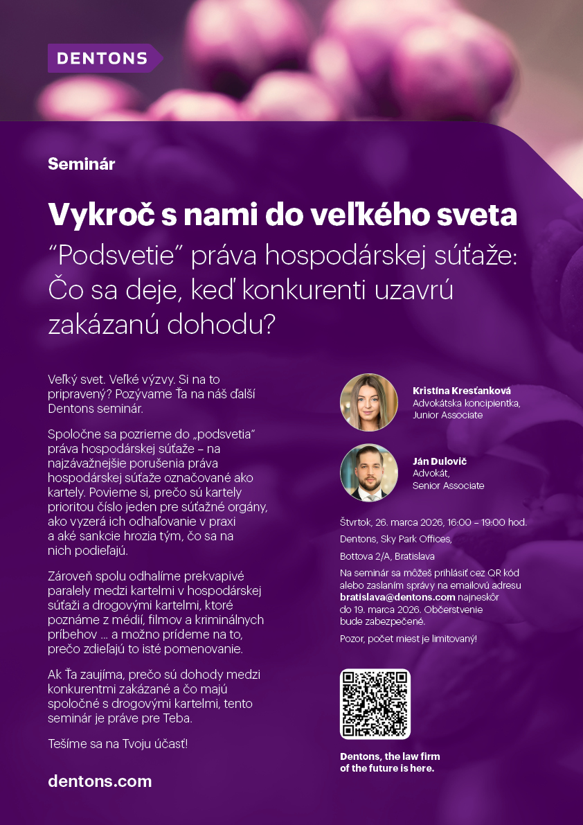 Seminár bude prebiehať v priestoroch kancelárie Dentons – Sky Park Offices, Bottova 2A, Bratislava dňa 26. marca 2026.