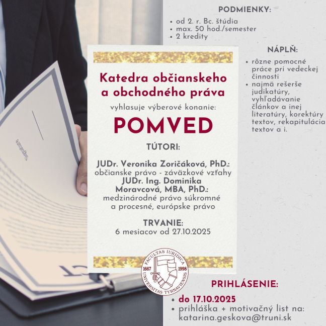Vážené študentky, vážení študenti, Katedra občianskeho a obchodného práva vyhlásila výberové konanie na pozíciu pomocnej študentskej vedeckej sily.